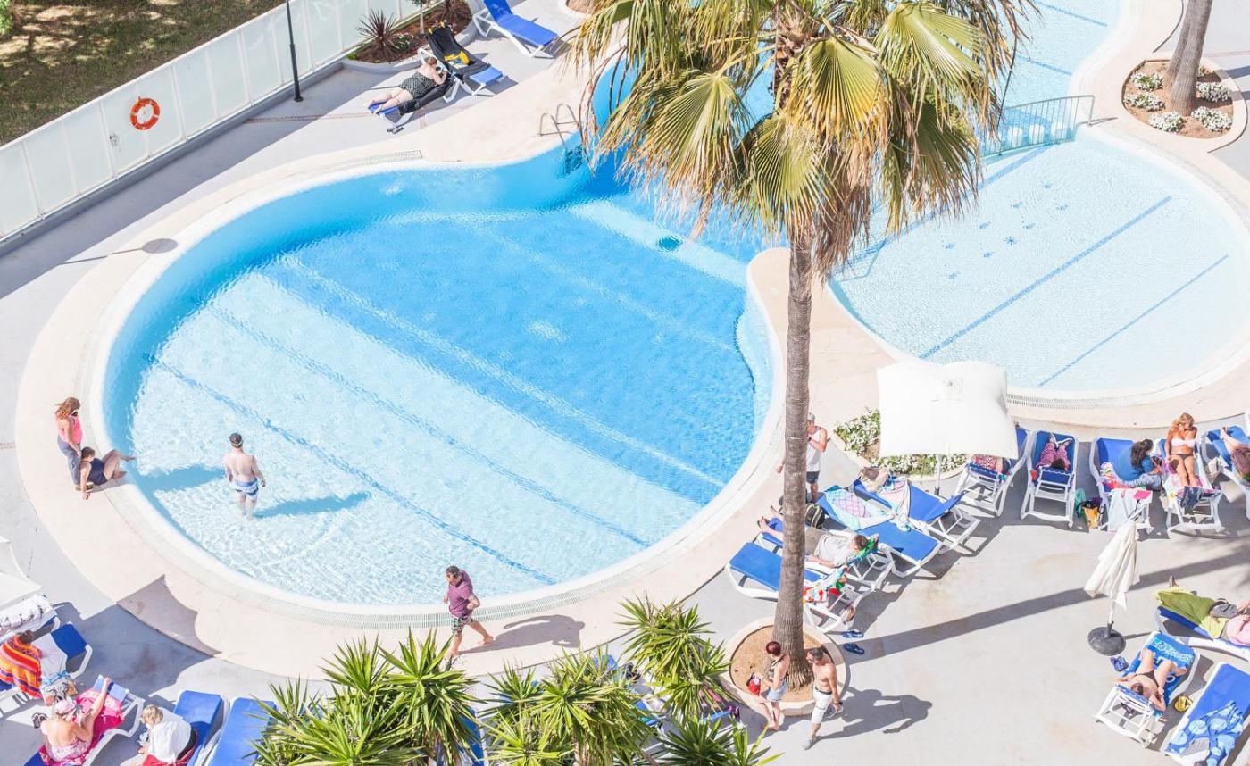 El BLUESEA Gran Playa alberga 3 piscinas al aire libre rodeadas de soláriums y jardines. Se encuentra en la playa de Sa Coma, en Mallorca.