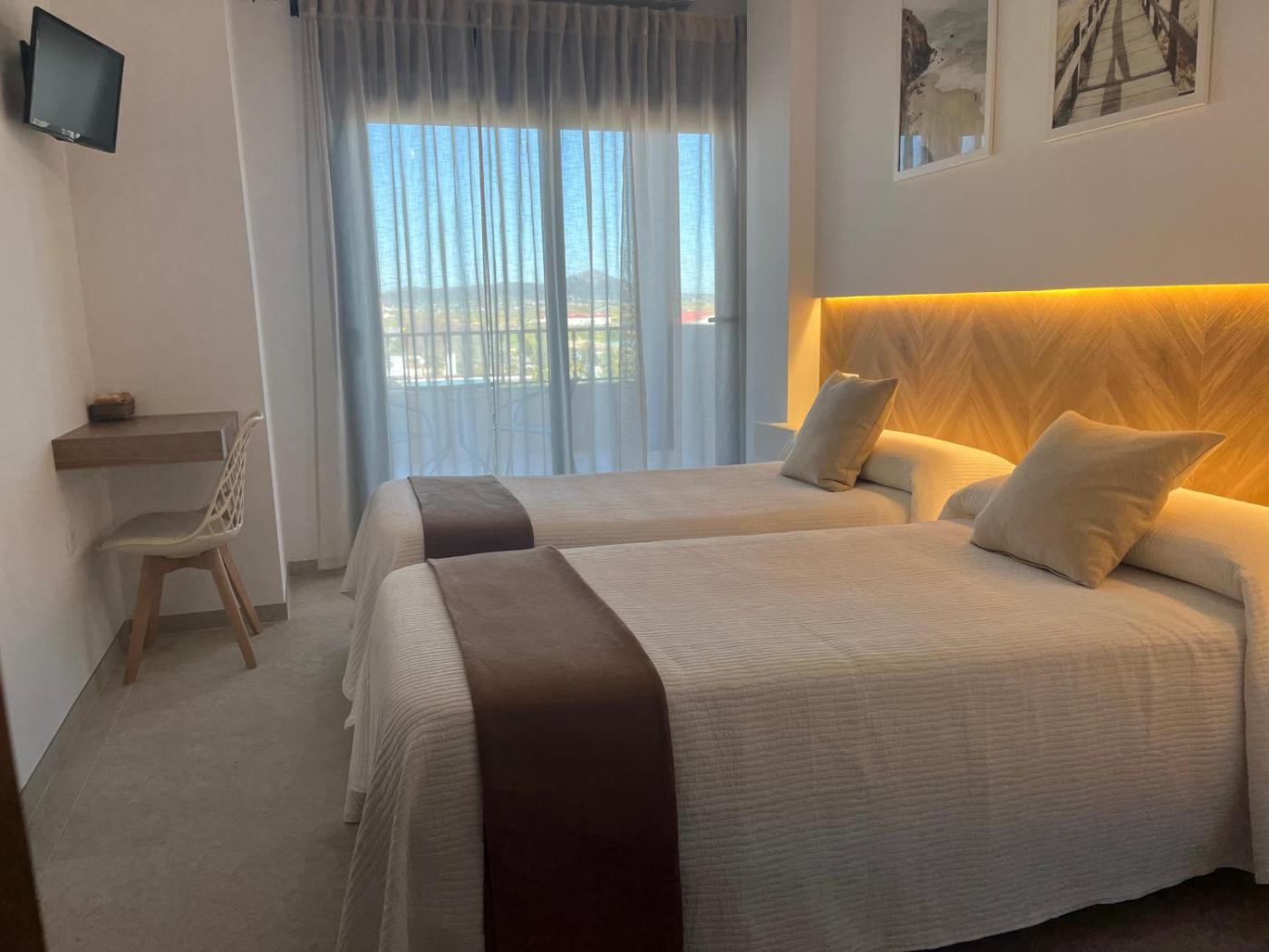 Habitación Doble con vistas - 2 camas. The twin room offers air conditioning, a private entrance, a terrace with city views as well as a private bathroom featuring a shower. The unit offers 2 beds. ;
