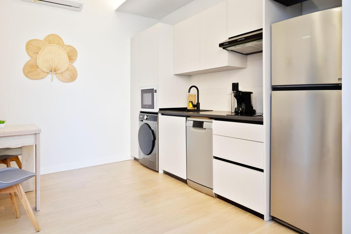 Apartamento de 1 dormitorio. El apartamento cuenta con aire acondicionado, 1 dormitorio, baño y cocina. La cocina del apartamento cuenta con espacio para guardar comida. Apartamento con lavadora y TV de pantalla plana. Incluye 2 camas.
